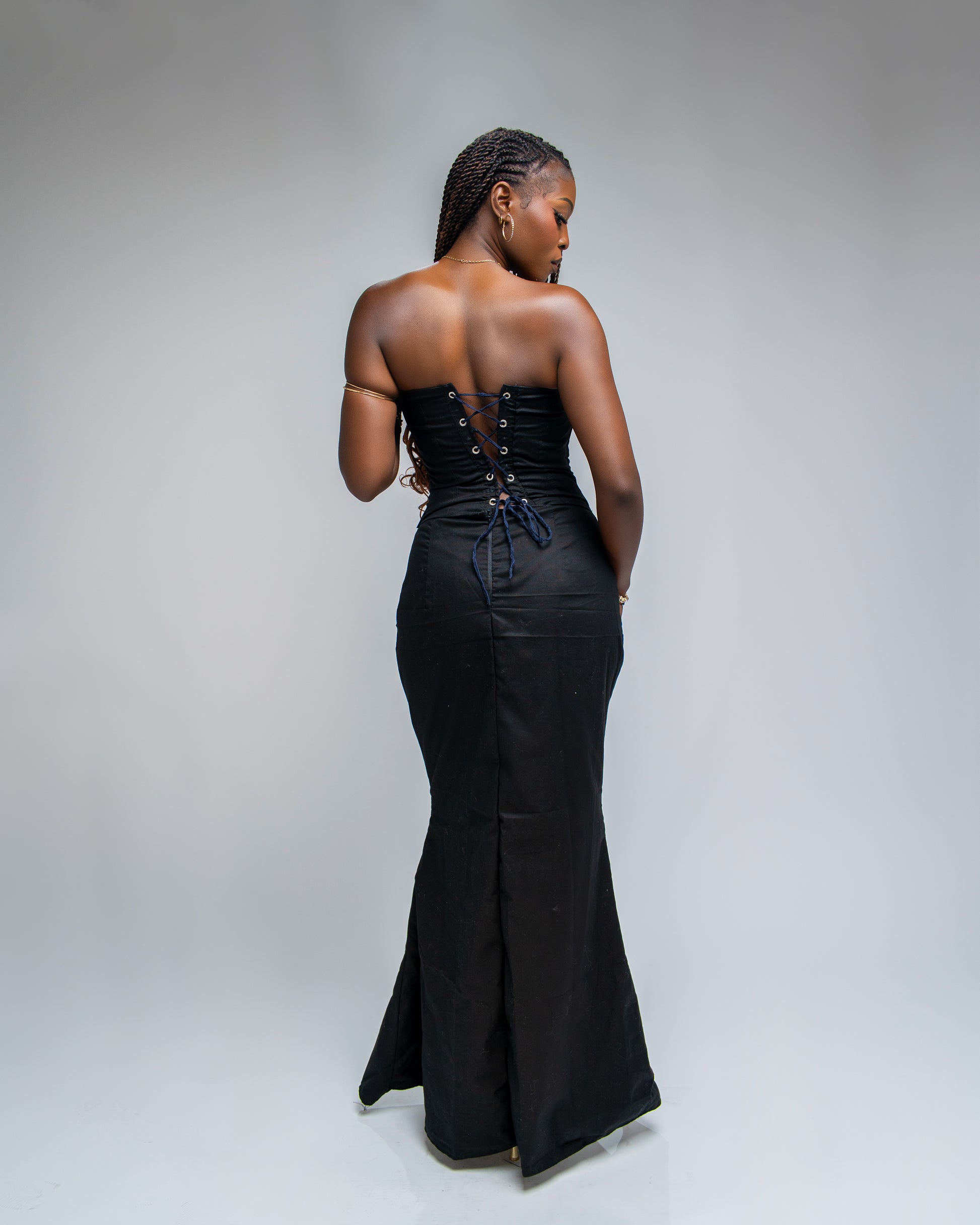 This striking formal gown is a full-length black dress with a dramatic and structured design. The dress features a unique strapless neckline that curves upward on the sides, creating a modern and architectural silhouette. The bodice is fitted and seamlessly transitions into a long, form-fitting skirt that flares slightly at the hem, creating a mermaid or trumpet shape. A notable design element is the corset-style lacing detail on the back, which adds a touch of classic sophistication and allows for an adjustable fit.