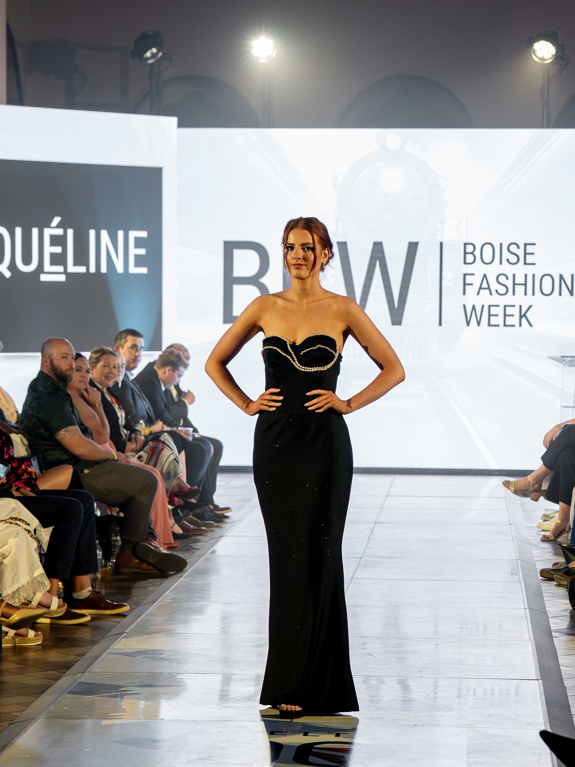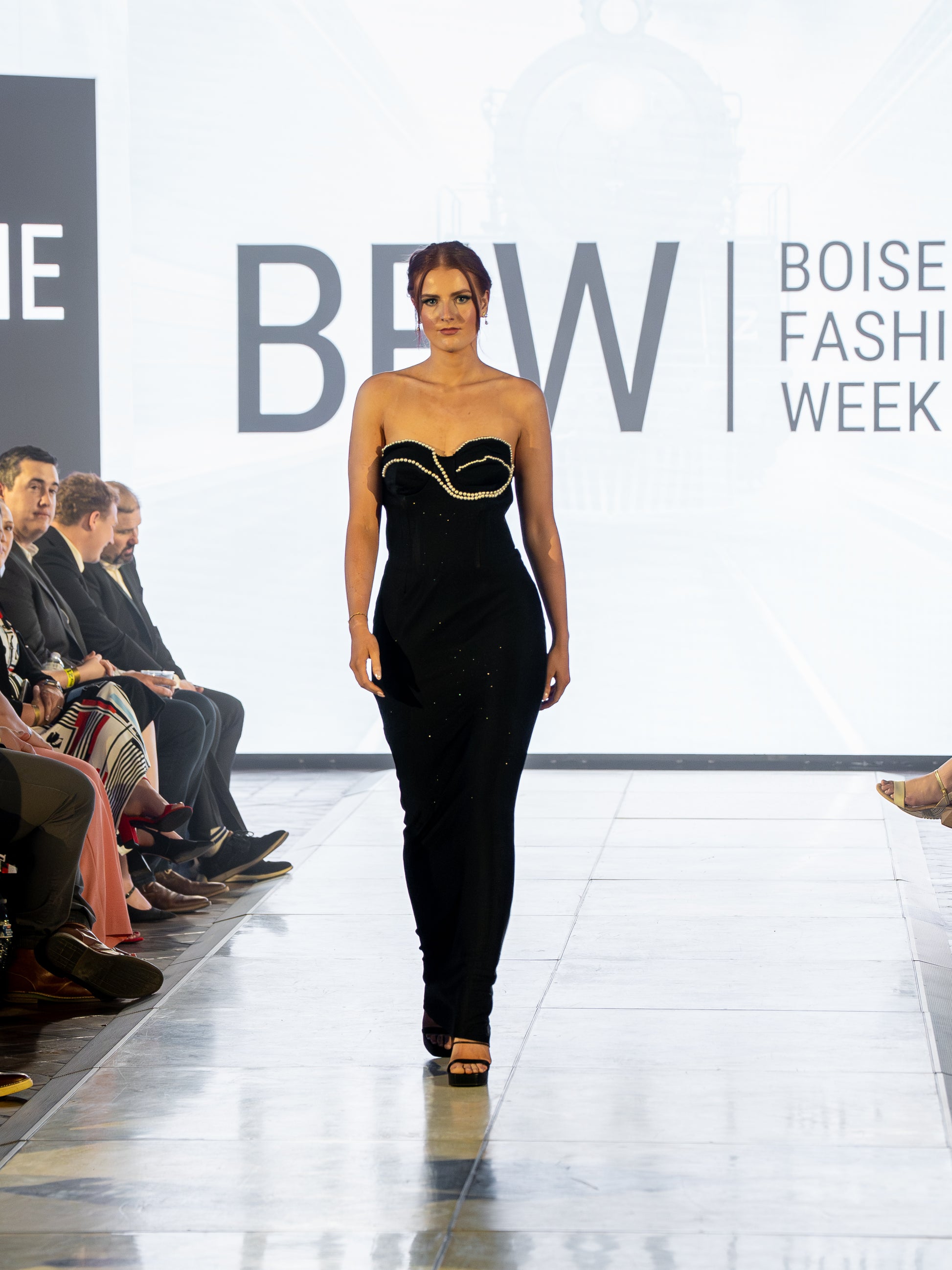 This elegant black formal dress is a strapless, floor-length gown with a sleek and form-fitting silhouette. The top of the dress features a sweetheart neckline adorned with a detailed pearl trim that outlines the bust, creating a sophisticated and eye-catching detail. The rest of the dress is a simple, straight cut that accentuates the figure.
