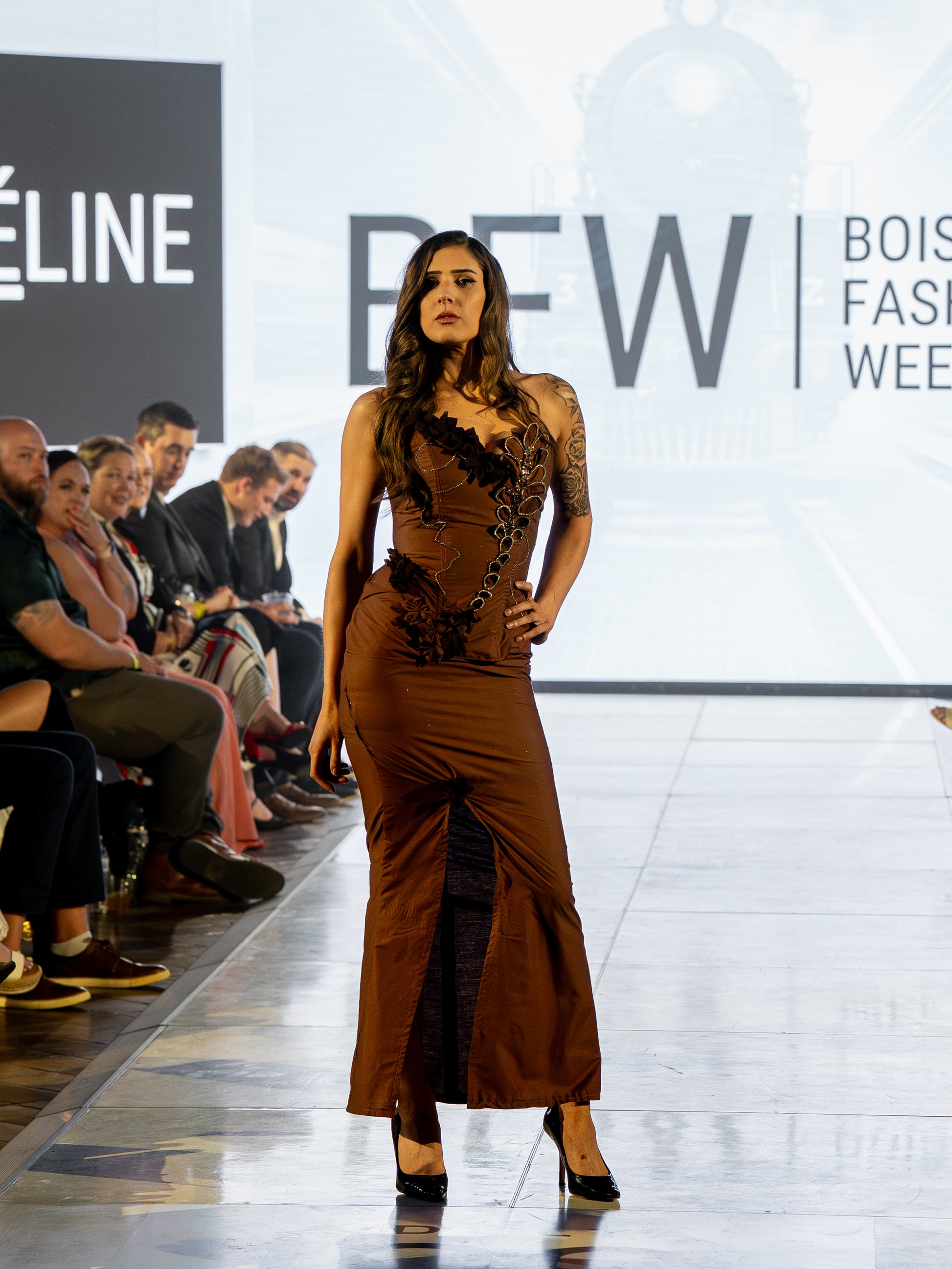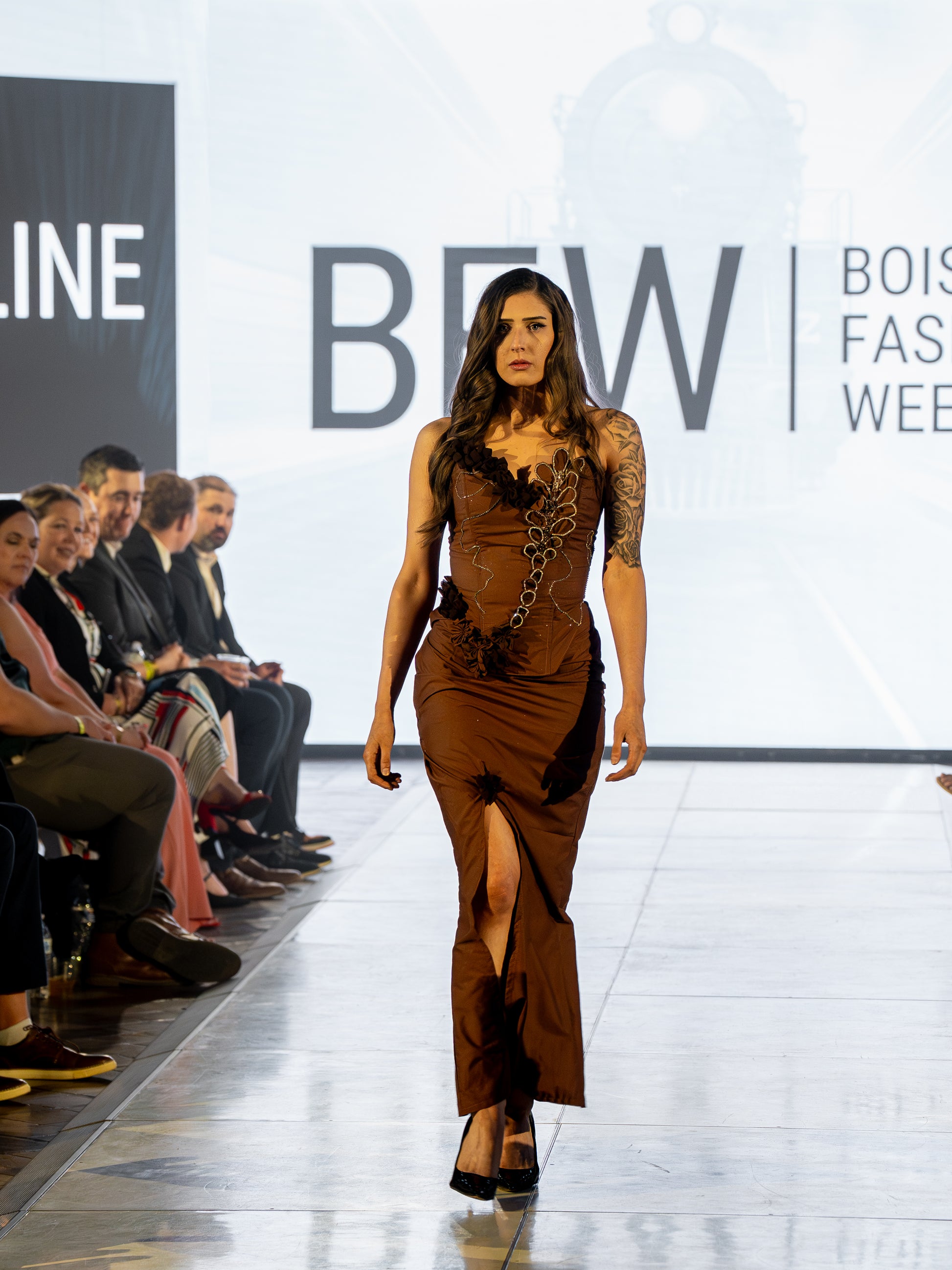 This striking formal gown is a two-piece ensemble in a rich, warm brown color. The outfit features a fitted, strapless corset top with intricate and elaborate embellishments. A large, stylized floral design, created with silver sequin-like. Additional beaded floral appliques are placed on the left side of the top and on the hip of the skirt. The long, straight skirt has a high slit on one leg, adding a touch of elegance and drama. The look is completed with simple gold hoop earrings and a delicate gold necklace.