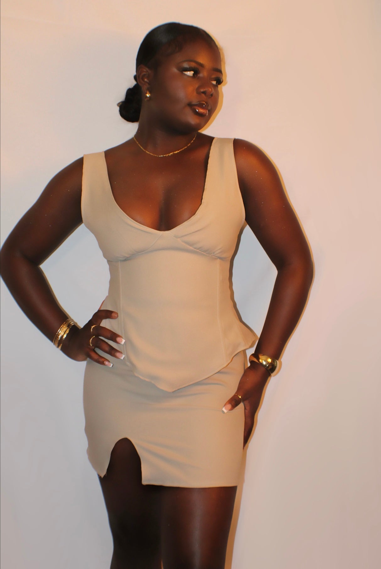 This stylish and form-fitting two piece is in a beautiful neutral tan or beige color. The set features a deep V-neckline and a structured bodice with thin straps. The front is a simple, sleek design with a high slit on one leg, adding a touch of allure. The back of the dress is the standout feature, with a detailed white corset-style lacing that runs vertically up the spine, creating a unique and elegant look.